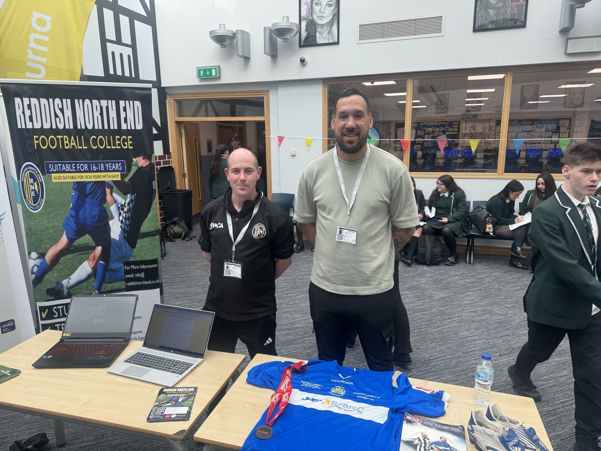 Students also enjoyed meeting former professional footballer Liam Dickinson. He spoke about his journey through football, starting in non league before playing for Stockport County. As well as running a practical session for students, he brought special items from his playing days, including a match worn shirt, medal and boots. Liam now runs a successful plumbing and heating business, and he explained how careers can change over time and why learning new skills is important.